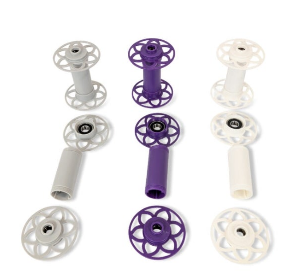 When purchasing pick between purple and black colors for the base. You’ll get two purple, two light gray, and two ivory bobbins (6 bobbins total). Each bobbin holds around 2 ounces of yarn.